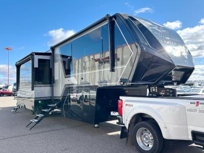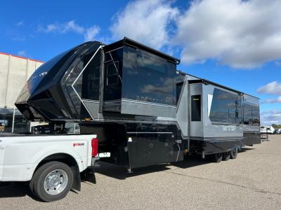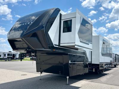 Unmatched luxury, an automotive exterior, tons of storage space, and intelligent features; it has to be a Model G toy hauler fifth wheel by Brinkley!