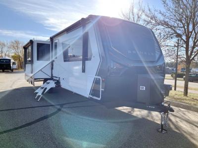 The drop frame chassis will provide a smooth tow from home to campground, and the one-touch automatic leveling system will have you set up in no time. You will love the sleek styling with automotive-grade exterior graphics, along with the square Euro frameless windows with 6" openings. Inside, there are premium residential cabinet and drawers, solid surface countertops, Brinkley's CraftSense wood trim construction, and many more premium features.