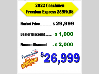 Pleasureland RV is not responsible for any misprints, typos, or errors found in our website pages. Any price listed excludes sales tax, registration tags, and delivery fees. Manufacturer pictures, specifications, and features may be used in place of actual units on our lot. Please contact us @800-862-8603 for availability as our inventory changes rapidly. All calculated payments are an estimate only and do not constitute a commitment that financing or a specific interest rate or term is available.