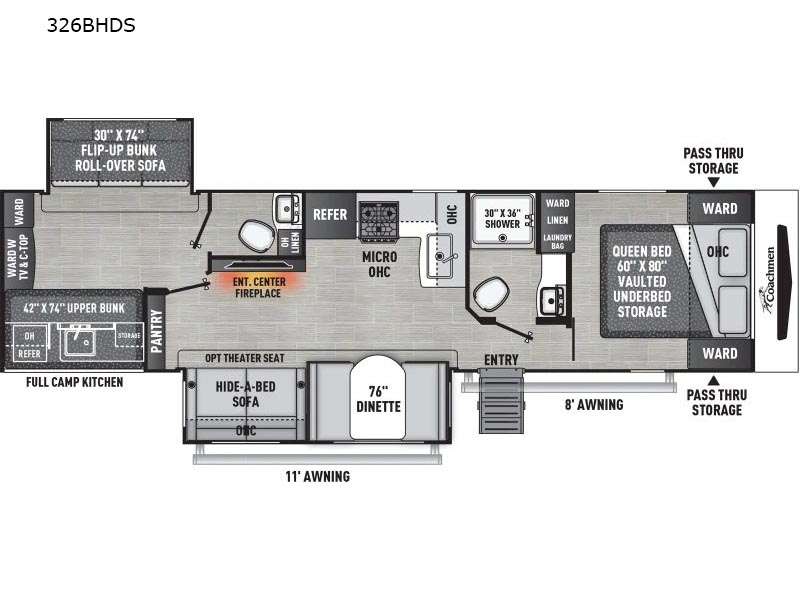 You will love taking a big group camping in this spacious travel trailer! The rear bunkhouse offers a flexible space with bunks plus a roll-over sofa. A half bath in the bunkhouse is ultra convenient, while the full bath includes a 30" x 36" shower. At the front you will enjoy privacy in the queen bedroom, which has vaulted underbed storage, dual wardrobes, plus a linen closet with its own laundry bag for extra convenience. Everyone will want to gather in the living area with its entertainment center with fireplace. The hide-a-bed sofa offers even more sleeping space, or swap it out for the optional theater seats for extra relaxation. The kitchen is well-equipped and the 76" dinette booth will have plenty of room. There's an outdoor camp kitchen as well if you'd prefer to cook outside.