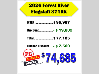 Pleasureland RV is not responsible for any misprints, typos, or errors found in our website pages. Any price listed excludes sales tax, registration tags, and delivery fees. Manufacturer pictures, specifications, and features may be used in place of actual units on our lot. Please contact us @800-862-8603 for availability as our inventory changes rapidly. All calculated payments are an estimate only and do not constitute a commitment that financing or a specific interest rate or term is available.