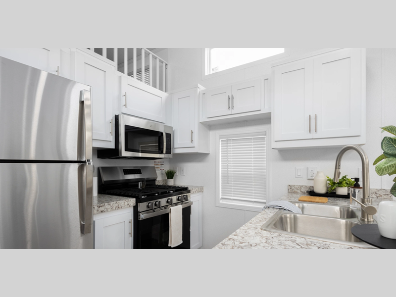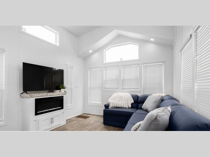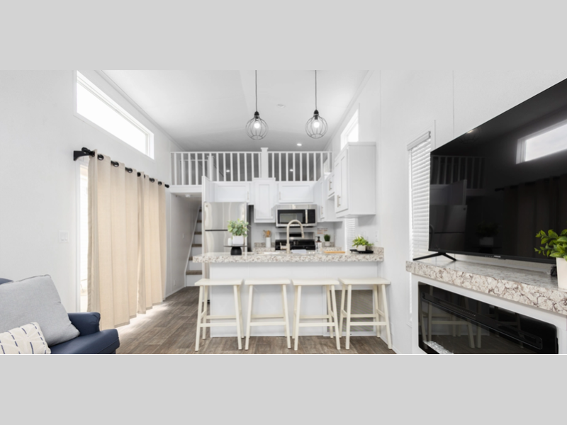 Each is built with a welded steel I-beam chassis, a corrosion resistant enclosed underbelly, and residential vinyl siding to name a few solid construction materials. The interior has residential touches, including cushion backed vinyl flooring, a stainless-steel sink, residential base trim, and a Serta queen bed for all-around comfort!