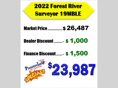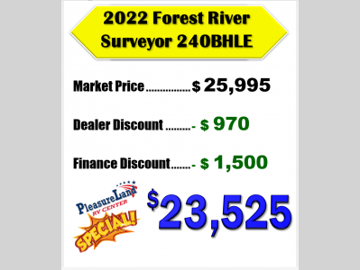 Pleasureland RV is not responsible for any misprints, typos, or errors found in our website pages. Any price listed excludes sales tax, registration tags, and delivery fees. Manufacturer pictures, specifications, and features may be used in place of actual units on our lot. Please contact us @800-862-8603 for availability as our inventory changes rapidly. All calculated payments are an estimate only and do not constitute a commitment that financing or a specific interest rate or term is available.