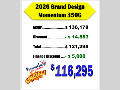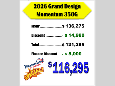 Pleasureland RV is not responsible for any misprints, typos, or errors found in our website pages. Any price listed excludes sales tax, registration tags, and delivery fees. Manufacturer pictures, specifications, and features may be used in place of actual units on our lot. Please contact us @800-862-8603 for availability as our inventory changes rapidly. All calculated payments are an estimate only and do not constitute a commitment that financing or a specific interest rate or term is available.