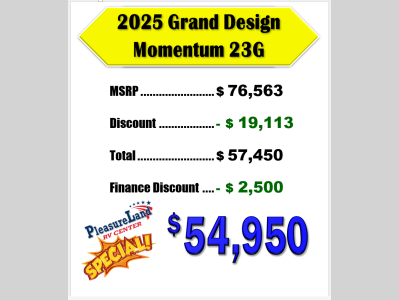 Pleasureland RV is not responsible for any misprints, typos, or errors found in our website pages. Any price listed excludes sales tax, registration tags, and delivery fees. Manufacturer pictures, specifications, and features may be used in place of actual units on our lot. Please contact us @800-862-8603 for availability as our inventory changes rapidly. All calculated payments are an estimate only and do not constitute a commitment that financing or a specific interest rate or term is available.