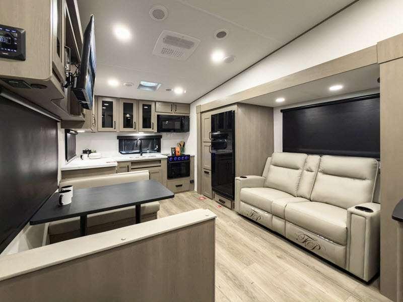 Each fifth wheel has 90-degre turning radius capabilities which allows you to be comfortable driving in town and parking into your campsite. Some construction and Arctic 4-Seasons Protection package features include a one-piece TPO roof membrane, a heated and enclosed underbelly with circulating heat, 12V heat pads on the holding tanks, and a heated pass-through storage area so you can travel and enjoy any climate. The interior offers large panoramic slide room windows for great views, premium Congoleum flooring for durability, and an On Demand water heater.