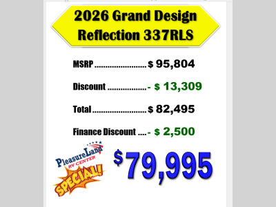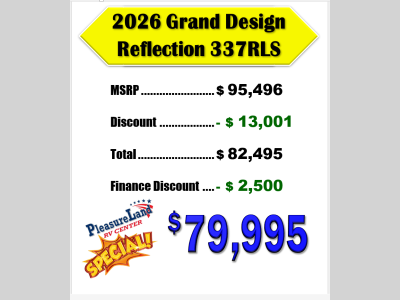Pleasureland RV is not responsible for any misprints, typos, or errors found in our website pages. Any price listed excludes sales tax, registration tags, and delivery fees. Manufacturer pictures, specifications, and features may be used in place of actual units on our lot. Please contact us @800-862-8603 for availability as our inventory changes rapidly. All calculated payments are an estimate only and do not constitute a commitment that financing or a specific interest rate or term is available.