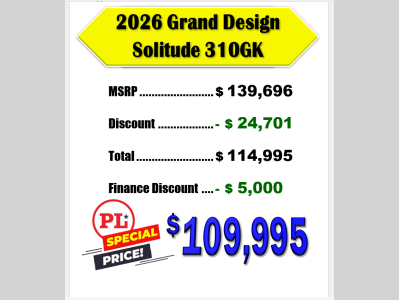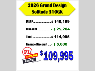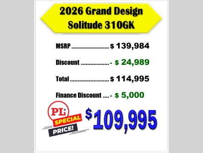 Pleasureland RV is not responsible for any misprints, typos, or errors found in our website pages. Any price listed excludes sales tax, registration tags, and delivery fees. Manufacturer pictures, specifications, and features may be used in place of actual units on our lot. Please contact us @800-862-8603 for availability as our inventory changes rapidly. All calculated payments are an estimate only and do not constitute a commitment that financing or a specific interest rate or term is available.