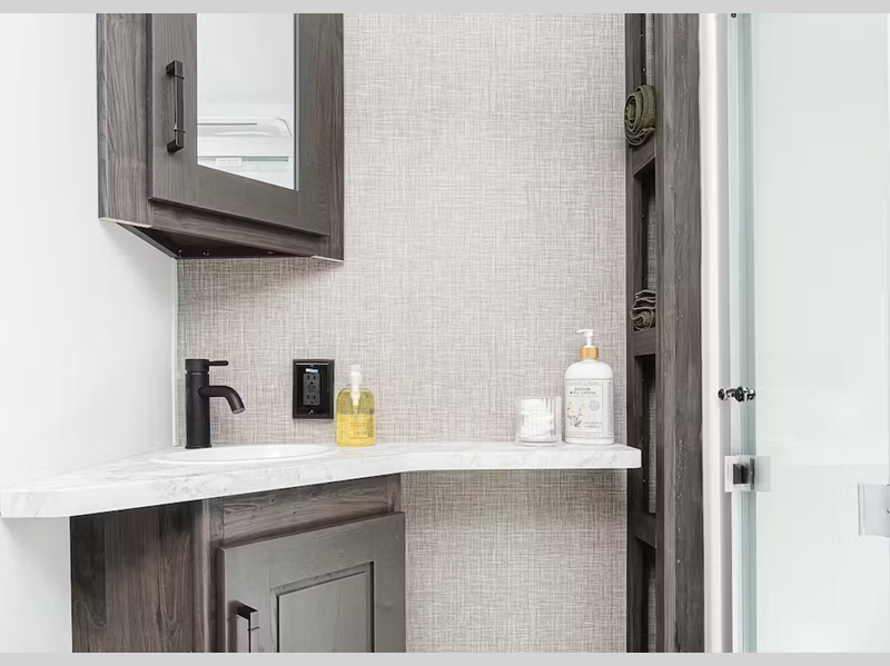 - Full-size, one piece fiberglass shower w/ seat and skylight