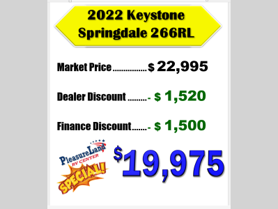 Here at PleasureLand RV, we offer the best prices and the best selection of Keystone Springdale RVs for sale in Minnesota. You will not find a better deal on an RV anywhere else in Minnesota. If you have any questions or you need help finding the right RV for you and your family, please contact us.
