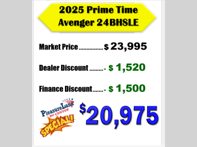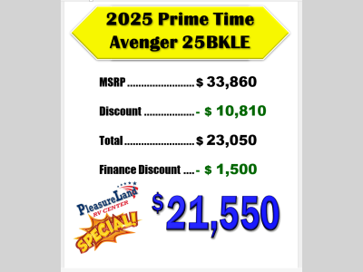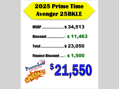 Pleasureland RV is not responsible for any misprints, typos, or errors found in our website pages. Any price listed excludes sales tax, registration tags, and delivery fees. Manufacturer pictures, specifications, and features may be used in place of actual units on our lot. Please contact us @800-862-8603 for availability as our inventory changes rapidly. All calculated payments are an estimate only and do not constitute a commitment that financing or a specific interest rate or term is available.