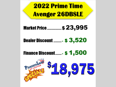Pleasureland RV is not responsible for any misprints, typos, or errors found in our website pages. Any price listed excludes sales tax, registration tags, and delivery fees. Manufacturer pictures, specifications, and features may be used in place of actual units on our lot. Please contact us @800-862-8603 for availability as our inventory changes rapidly. All calculated payments are an estimate only and do not constitute a commitment that financing or a specific interest rate or term is available.