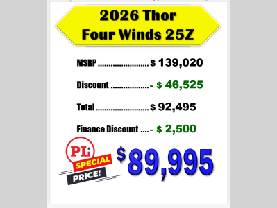 Pleasureland RV is not responsible for any misprints, typos, or errors found in our website pages. Any price listed excludes sales tax, registration tags, and delivery fees. Manufacturer pictures, specifications, and features may be used in place of actual units on our lot. Please contact us @800-862-8603 for availability as our inventory changes rapidly. All calculated payments are an estimate only and do not constitute a commitment that financing or a specific interest rate or term is available.