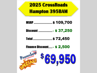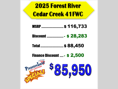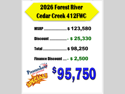 Pleasureland RV is not responsible for any misprints, typos, or errors found in our website pages. Any price listed excludes sales tax, registration tags, and delivery fees. Manufacturer pictures, specifications, and features may be used in place of actual units on our lot. Please contact us @800-862-8603 for availability as our inventory changes rapidly. All calculated payments are an estimate only and do not constitute a commitment that financing or a specific interest rate or term is available.
