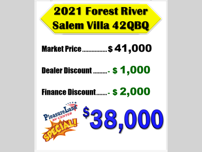 Pleasureland RV is not responsible for any misprints, typos, or errors found in our website pages. Any price listed excludes sales tax, registration tags, and delivery fees. Manufacturer pictures, specifications, and features may be used in place of actual units on our lot. Please contact us @800-862-8603 for availability as our inventory changes rapidly. All calculated payments are an estimate only and do not constitute a commitment that financing or a specific interest rate or term is available.