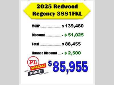 Pleasureland RV is not responsible for any misprints, typos, or errors found in our website pages. Any price listed excludes sales tax, registration tags, and delivery fees. Manufacturer pictures, specifications, and features may be used in place of actual units on our lot. Please contact us @800-862-8603 for availability as our inventory changes rapidly. All calculated payments are an estimate only and do not constitute a commitment that financing or a specific interest rate or term is available.