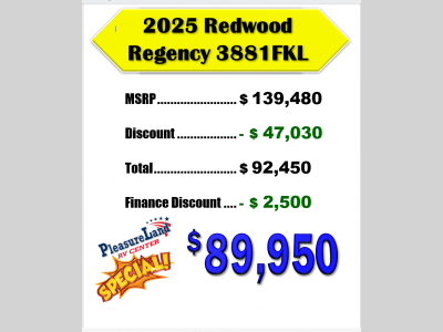 Pleasureland RV is not responsible for any misprints, typos, or errors found in our website pages. Any price listed excludes sales tax, registration tags, and delivery fees. Manufacturer pictures, specifications, and features may be used in place of actual units on our lot. Please contact us @800-862-8603 for availability as our inventory changes rapidly. All calculated payments are an estimate only and do not constitute a commitment that financing or a specific interest rate or term is available.