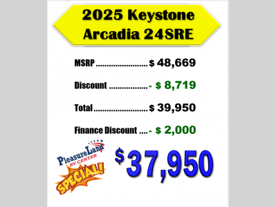 Pleasureland RV is not responsible for any misprints, typos, or errors found in our website pages. Any price listed excludes sales tax, registration tags, and delivery fees. Manufacturer pictures, specifications, and features may be used in place of actual units on our lot. Please contact us @800-862-8603 for availability as our inventory changes rapidly. All calculated payments are an estimate only and do not constitute a commitment that financing or a specific interest rate or term is available.