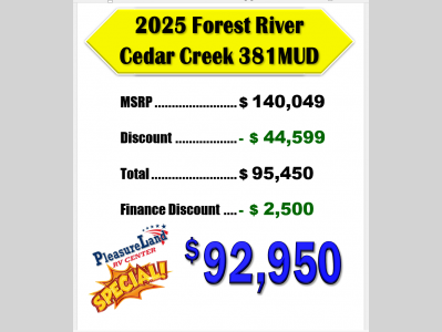 Pleasureland RV is not responsible for any misprints, typos, or errors found in our website pages. Any price listed excludes sales tax, registration tags, and delivery fees. Manufacturer pictures, specifications, and features may be used in place of actual units on our lot. Please contact us @800-862-8603 for availability as our inventory changes rapidly. All calculated payments are an estimate only and do not constitute a commitment that financing or a specific interest rate or term is available.