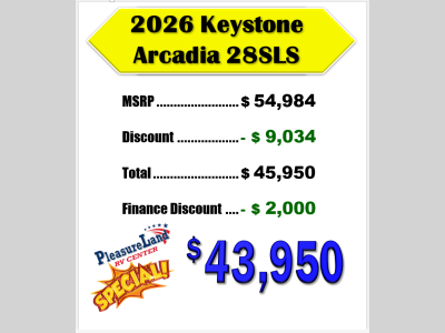 Pleasureland RV is not responsible for any misprints, typos, or errors found in our website pages. Any price listed excludes sales tax, registration tags, and delivery fees. Manufacturer pictures, specifications, and features may be used in place of actual units on our lot. Please contact us @800-862-8603 for availability as our inventory changes rapidly. All calculated payments are an estimate only and do not constitute a commitment that financing or a specific interest rate or term is available.