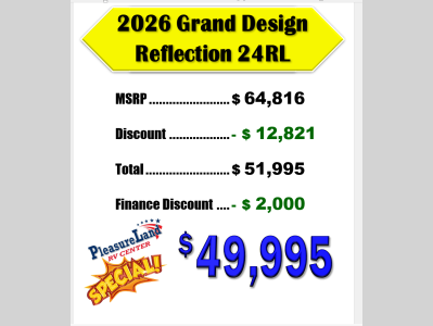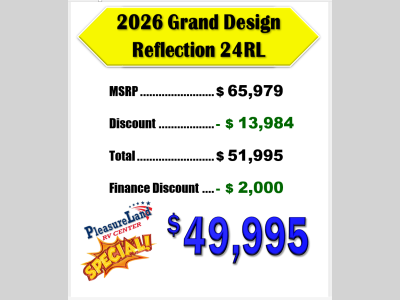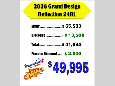 Pleasureland RV is not responsible for any misprints, typos, or errors found in our website pages. Any price listed excludes sales tax, registration tags, and delivery fees. Manufacturer pictures, specifications, and features may be used in place of actual units on our lot. Please contact us @800-862-8603 for availability as our inventory changes rapidly. All calculated payments are an estimate only and do not constitute a commitment that financing or a specific interest rate or term is available.