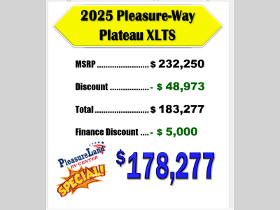 Pleasureland RV is not responsible for any misprints, typos, or errors found in our website pages. Any price listed excludes sales tax, registration tags, and delivery fees. Manufacturer pictures, specifications, and features may be used in place of actual units on our lot. Please contact us @800-862-8603 for availability as our inventory changes rapidly. All calculated payments are an estimate only and do not constitute a commitment that financing or a specific interest rate or term is available.