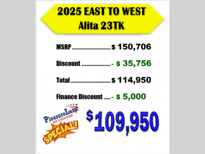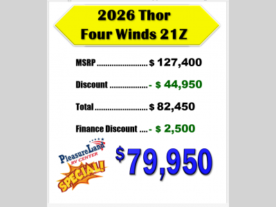 Pleasureland RV is not responsible for any misprints, typos, or errors found in our website pages. Any price listed excludes sales tax, registration tags, and delivery fees. Manufacturer pictures, specifications, and features may be used in place of actual units on our lot. Please contact us @800-862-8603 for availability as our inventory changes rapidly. All calculated payments are an estimate only and do not constitute a commitment that financing or a specific interest rate or term is available.
