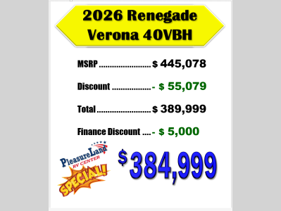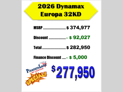 Pleasureland RV is not responsible for any misprints, typos, or errors found in our website pages. Any price listed excludes sales tax, registration tags, and delivery fees. Manufacturer pictures, specifications, and features may be used in place of actual units on our lot. Please contact us @800-862-8603 for availability as our inventory changes rapidly. All calculated payments are an estimate only and do not constitute a commitment that financing or a specific interest rate or term is available.