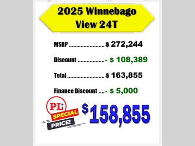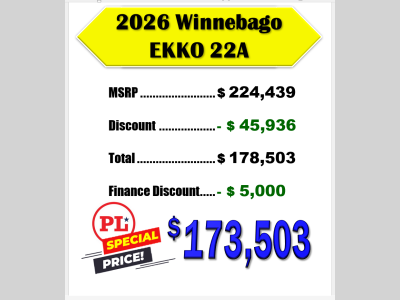 Pleasureland RV is not responsible for any misprints, typos, or errors found in our website pages. Any price listed excludes sales tax, registration tags, and delivery fees. Manufacturer pictures, specifications, and features may be used in place of actual units on our lot. Please contact us @800-862-8603 for availability as our inventory changes rapidly. All calculated payments are an estimate only and do not constitute a commitment that financing or a specific interest rate or term is available.