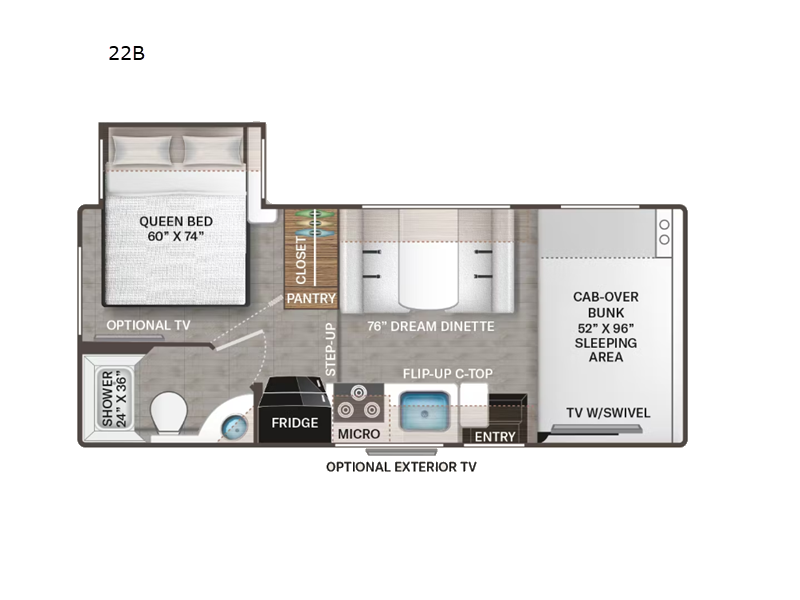Easily head out for fun at a state park, the lake or your friend's ranch. This coach is easy to maneuver on the road or in town thanks to its compact size, yet has so many conveniences, you might not return home. The front cab over bunk is a perfect sleeping space for guests, the 40" TV allows you to watch shows when you want some inside time, and the dream dinette gives you a place to dine and relax. The cook will love all the kitchen amenities at their fingertips, plus the flip-up countertop extension is super handy. The rear corner bedroom offers a queen bed slide for more floor space, a privacy curtain and a closet, plus the full bathroom is a few steps away. You can also choose to add the optional exterior 32" TV for outdoor fun!