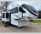 Five slide outs, a full bathroom with dual sinks, a half bath off of the kitchen, and a separate front living room and entertainment area are a few reasons you will enjoy your time spent in this fifth wheel! The separate kitchen is a dream with stainless steel appliances including a built-in oven, a pantry and hutch with counter space, a kitchen island plus a free-standing dinette slide with windows for great views. The entertainment center offers an LED Smart TV with a fireplace below and storage, and the dual opposing tri-fold sofas provide added sleeping space at night. The master bedroom includes a queen bed plus space savings sliding doors that lead you to the rear full bathroom with dual sinks, linen storage, and washer/dryer prep. The exterior has several storage choices as well including a pass-through compartment for fishing poles and such, plus the unique sliding tray in the rear allows you to bring along larger items such as camping tables, portable grills, golf clubs, totes and more.