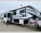 Enjoy each and every vacation, month-long trips, or even extended stays at an RV park in this spacious fifth wheel! The raised rear kitchen gives the cook plenty of room to whip up any type of meal using the stainless steel appliances including a 24" residential oven, an oversized pantry, and the raised bar top will provide you even more counter space on top of dining with two chairs that overlook the middle living area. Relaxing is made easy thanks to two tri-fold sofas and theatre seating while watching the big game on the LED Smart TV and enjoying the fireplace below. Dual sinks in the full bathroom allow two people to easily get ready at once, and the flip up teak seat in the shower is a nice convenience. At night, retire to your own queen bed which slides out to provide more floor space, and enjoy a show on the LED TV above the flip-top dresser once in bed.