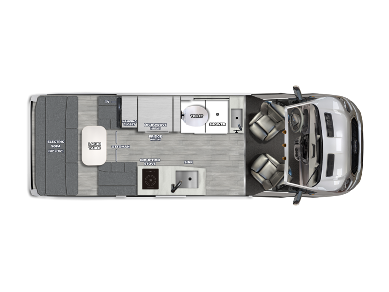 This 2.2 Ontour model is similar to model 2.0, but with a larger refrigerator, and more storage space in the bath. The rear power sofa converts to a 68" x 76" queen-sized bed with memory foam cushions for all-around comfort and the wet bath allows you to clean up each day. There is also a vanity with storage, a sink, and a Corian countertop in the bath for added convenience. Prepare meals either on the one burner induction stove top or in the microwave oven and clean up will be a breeze with a stainless steel sink that includes a high-arc faucet.