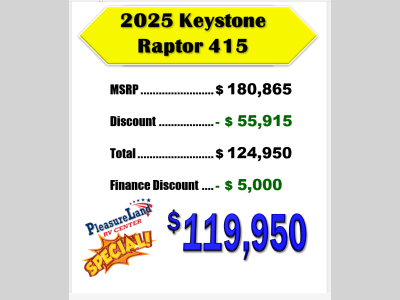 Pleasureland RV is not responsible for any misprints, typos, or errors found in our website pages. Any price listed excludes sales tax, registration tags, and delivery fees. Manufacturer pictures, specifications, and features may be used in place of actual units on our lot. Please contact us @800-862-8603 for availability as our inventory changes rapidly. All calculated payments are an estimate only and do not constitute a commitment that financing or a specific interest rate or term is available.