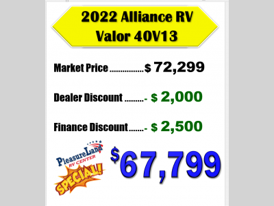 Pleasureland RV is not responsible for any misprints, typos, or errors found in our website pages. Any price listed excludes sales tax, registration tags, and delivery fees. Manufacturer pictures, specifications, and features may be used in place of actual units on our lot. Please contact us @800-862-8603 for availability as our inventory changes rapidly. All calculated payments are an estimate only and do not constitute a commitment that financing or a specific interest rate or term is available.