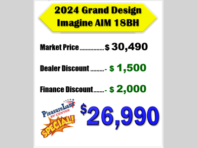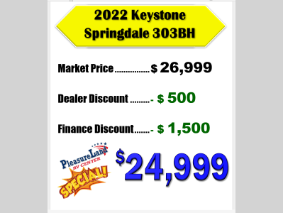 Pleasureland RV is not responsible for any misprints, typos, or errors found in our website pages. Any price listed excludes sales tax, registration tags, and delivery fees. Manufacturer pictures, specifications, and features may be used in place of actual units on our lot. Please contact us @800-862-8603 for availability as our inventory changes rapidly. All calculated payments are an estimate only and do not constitute a commitment that financing or a specific interest rate or term is available.