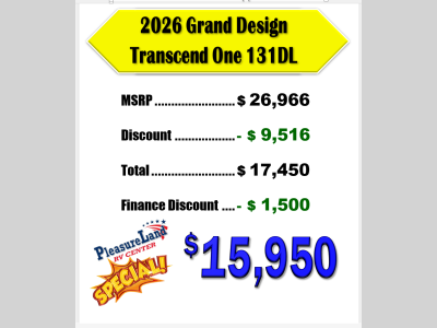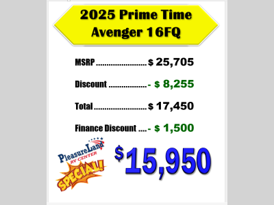 Pleasureland RV is not responsible for any misprints, typos, or errors found in our website pages. Any price listed excludes sales tax, registration tags, and delivery fees. Manufacturer pictures, specifications, and features may be used in place of actual units on our lot. Please contact us @800-862-8603 for availability as our inventory changes rapidly. All calculated payments are an estimate only and do not constitute a commitment that financing or a specific interest rate or term is available.