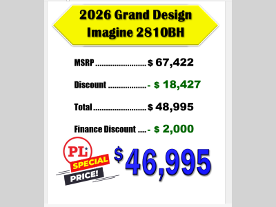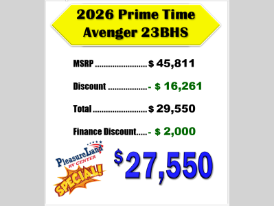 Pleasureland RV is not responsible for any misprints, typos, or errors found in our website pages. Any price listed excludes sales tax, registration tags, and delivery fees. Manufacturer pictures, specifications, and features may be used in place of actual units on our lot. Please contact us @800-862-8603 for availability as our inventory changes rapidly. All calculated payments are an estimate only and do not constitute a commitment that financing or a specific interest rate or term is available.