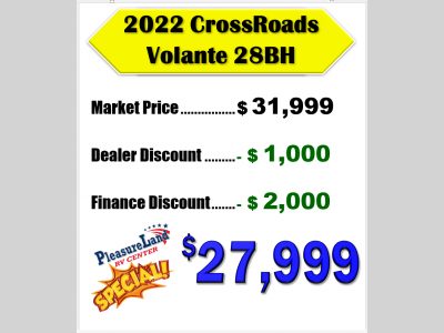 Pleasureland RV is not responsible for any misprints, typos, or errors found in our website pages. Any price listed excludes sales tax, registration tags, and delivery fees. Manufacturer pictures, specifications, and features may be used in place of actual units on our lot. Please contact us @800-862-8603 for availability as our inventory changes rapidly. All calculated payments are an estimate only and do not constitute a commitment that financing or a specific interest rate or term is available.