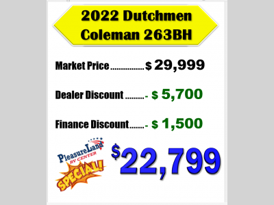 Pleasureland RV is not responsible for any misprints, typos, or errors found in our website pages. Any price listed excludes sales tax, registration tags, and delivery fees. Manufacturer pictures, specifications, and features may be used in place of actual units on our lot. Please contact us @800-862-8603 for availability as our inventory changes rapidly. All calculated payments are an estimate only and do not constitute a commitment that financing or a specific interest rate or term is available.