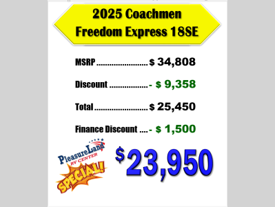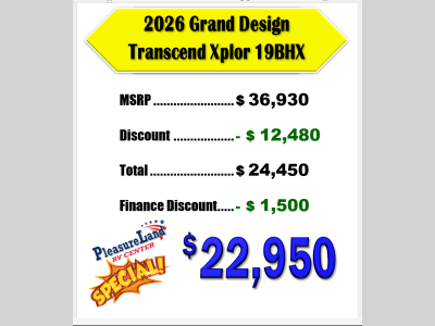 Pleasureland RV is not responsible for any misprints, typos, or errors found in our website pages. Any price listed excludes sales tax, registration tags, and delivery fees. Manufacturer pictures, specifications, and features may be used in place of actual units on our lot. Please contact us @800-862-8603 for availability as our inventory changes rapidly. All calculated payments are an estimate only and do not constitute a commitment that financing or a specific interest rate or term is available.