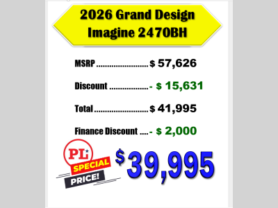 Pleasureland RV is not responsible for any misprints, typos, or errors found in our website pages. Any price listed excludes sales tax, registration tags, and delivery fees. Manufacturer pictures, specifications, and features may be used in place of actual units on our lot. Please contact us @800-862-8603 for availability as our inventory changes rapidly. All calculated payments are an estimate only and do not constitute a commitment that financing or a specific interest rate or term is available.