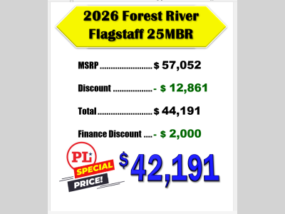 Pleasureland RV is not responsible for any misprints, typos, or errors found in our website pages. Any price listed excludes sales tax, registration tags, and delivery fees. Manufacturer pictures, specifications, and features may be used in place of actual units on our lot. Please contact us @800-862-8603 for availability as our inventory changes rapidly. All calculated payments are an estimate only and do not constitute a commitment that financing or a specific interest rate or term is available.