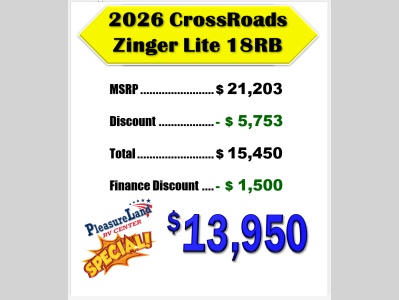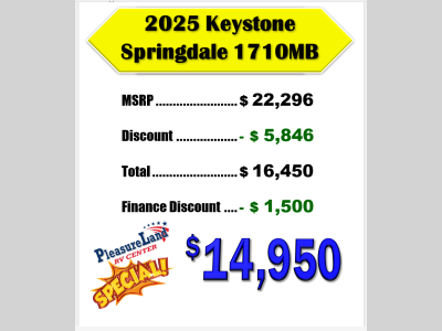 Pleasureland RV is not responsible for any misprints, typos, or errors found in our website pages. Any price listed excludes sales tax, registration tags, and delivery fees. Manufacturer pictures, specifications, and features may be used in place of actual units on our lot. Please contact us @800-862-8603 for availability as our inventory changes rapidly. All calculated payments are an estimate only and do not constitute a commitment that financing or a specific interest rate or term is available.