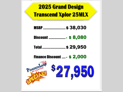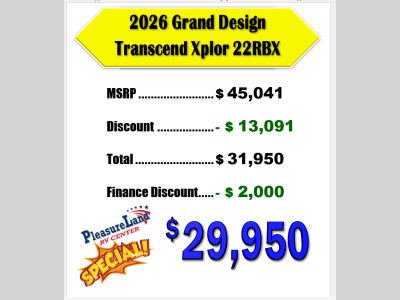 Pleasureland RV is not responsible for any misprints, typos, or errors found in our website pages. Any price listed excludes sales tax, registration tags, and delivery fees. Manufacturer pictures, specifications, and features may be used in place of actual units on our lot. Please contact us @800-862-8603 for availability as our inventory changes rapidly. All calculated payments are an estimate only and do not constitute a commitment that financing or a specific interest rate or term is available.