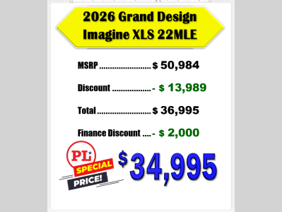 Pleasureland RV is not responsible for any misprints, typos, or errors found in our website pages. Any price listed excludes sales tax, registration tags, and delivery fees. Manufacturer pictures, specifications, and features may be used in place of actual units on our lot. Please contact us @800-862-8603 for availability as our inventory changes rapidly. All calculated payments are an estimate only and do not constitute a commitment that financing or a specific interest rate or term is available.