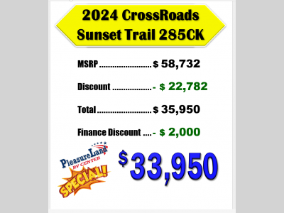 Pleasureland RV is not responsible for any misprints, typos, or errors found in our website pages. Any price listed excludes sales tax, registration tags, and delivery fees. Manufacturer pictures, specifications, and features may be used in place of actual units on our lot. Please contact us @800-862-8603 for availability as our inventory changes rapidly. All calculated payments are an estimate only and do not constitute a commitment that financing or a specific interest rate or term is available.