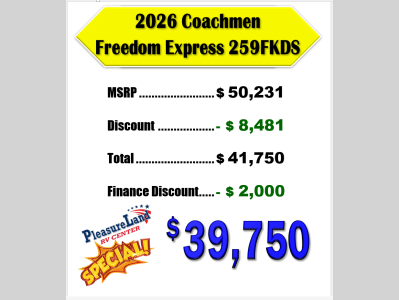 Pleasureland RV is not responsible for any misprints, typos, or errors found in our website pages. Any price listed excludes sales tax, registration tags, and delivery fees. Manufacturer pictures, specifications, and features may be used in place of actual units on our lot. Please contact us @800-862-8603 for availability as our inventory changes rapidly. All calculated payments are an estimate only and do not constitute a commitment that financing or a specific interest rate or term is available.