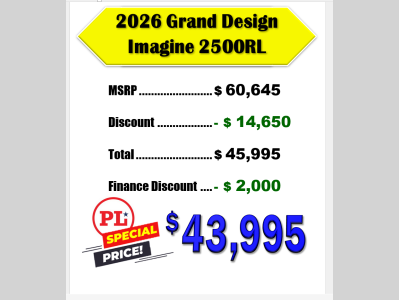 Pleasureland RV is not responsible for any misprints, typos, or errors found in our website pages. Any price listed excludes sales tax, registration tags, and delivery fees. Manufacturer pictures, specifications, and features may be used in place of actual units on our lot. Please contact us @800-862-8603 for availability as our inventory changes rapidly. All calculated payments are an estimate only and do not constitute a commitment that financing or a specific interest rate or term is available.