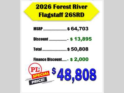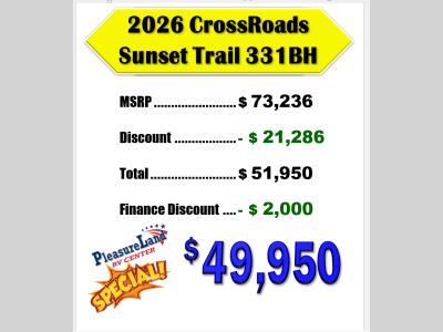 Pleasureland RV is not responsible for any misprints, typos, or errors found in our website pages. Any price listed excludes sales tax, registration tags, and delivery fees. Manufacturer pictures, specifications, and features may be used in place of actual units on our lot. Please contact us @800-862-8603 for availability as our inventory changes rapidly. All calculated payments are an estimate only and do not constitute a commitment that financing or a specific interest rate or term is available.